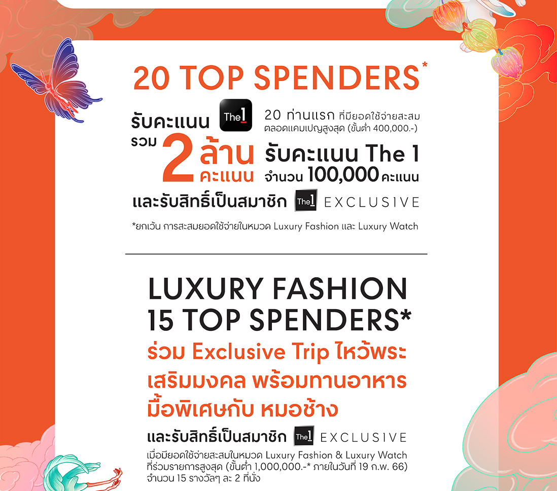 เงื่อนไขรวม • เงื่อนไขเป็นไปตามที่บริษัท ห้าง ร้านค้า ธนาคาร และพันธมิตรที่ร่วมรายการกำหนด • โปรดตรวจสอบข้อมูลและเงื่อนไขเพิ่มเติม ณ สื่ออื่นๆ จุดขาย หรือจุดแลกของสมนาคุณของศูนย์การค้า • สงวนสิทธิ์เฉพาะยอดใช้จ่ายจากร้านค้าในโซนพลาซา และใบเสร็จจาก NGG Jewellery ณ ศูนย์การค้าเซ็นทรัลทุกสาขา และ เอสพละนาด รัชดาภิเษก รวม 37 สาขาทั่วประเทศ เท่านั้น • ไม่รวมใบเสร็จจาก ห้างสรรพสินค้าเซ็นทรัล โรบินสัน ท็อปส์ มาร์เก็ต เซ็นทรัล ฟู้ด ฮอลล์ เพาเวอร์บาย ซูเปอร์สปอร์ต บีทูเอส โฮมเวิร์ค ออฟฟิศเมท แฟมิลี่มาร์ท โรงแรมในเครือเซ็นทารา www.central.co.th และ www.jd.co.th เว้นแต่กำหนดไว้เป็นอย่างอื่น • ไม่รวมใบเสร็จจาก การซื้อเพื่อลงทุน การค้า ขายส่ง การซื้อทองหรือเพชร ไม่รับใบจองสินค้า ใบมัดจำค่าสินค้า การแยกใบเสร็จจากยอดซื้อเพียงรายการเดียว ใบเสร็จจากฟู้ดคอร์ท รวมถึงการชำระค่าสาธารณูปโภค การทำธุรกรรมทางการเงินทุกประเภท การชำระเบี้ยประกัน การเติมเงินในบัตรเติมเงินทุกชนิดหรือการซื้อบัตรแทนเงินสดทุกชนิด การใช้บริการ Kerry Express และ ไปรษณีย์ไทย • สามารถรวบรวมใบเสร็จภายในวันและสาขาเดียวกันเฉพาะศูนย์การค้าเซ็นทรัลเท่านั้น • สามารถรวบรวมใบเสร็จได้สูงสุดไม่เกิน 10 ใบเสร็จ • สงวนสิทธิ์เฉพาะใบเสร็จที่ออกโดยเครื่องแคชเชียร์หรือใบกำกับภาษี ใบเสร็จรับเงินที่ถูกต้อง สามารถตรวจสอบได้ และเป็นไปตามที่บริษัทฯ กำหนดเท่านั้น • สงวนสิทธิ์เฉพาะใบเสร็จที่ทำการลงทะเบียนภายในวันและสาขาที่ซื้อสินค้าเท่านั้น • รับสิทธิ์ในสาขาที่ซื้อสินค้าเท่านั้น • นำใบเสร็จรับเงินไปลงทะเบียนที่จุดแลกของสมนาคุณของศูนย์การค้า เพื่อรับสิทธิ์ • ไม่สามารถนำใบเสร็จที่ลงทะเบียนรับสิทธิ์แล้ว กลับมาใช้ซ้ำได้ • เงื่อนไขบัตรเครดิต และพันธมิตรที่ร่วมรายการเป็นไปตามที่บริษัท ฯ และธนาคารกำหนด ลงทะเบียนรับสิทธิ ณ จุดแลกของสมนาคุณของศูนย์การค้าเซ็นทรัล • สงวนสิทธิ์เฉพาะใบเสร็จที่ใช้จ่ายผ่านบัตรเครดิตที่ร่วมรายการเท่านั้น เพื่อรับสิทธิพิเศษของบัตรเครดิต • สามารถเลือกใช้สิทธิพิเศษอย่างใดอย่างหนึ่งเท่านั้น • สงวนสิทธิ์ในการรับสิทธิพิเศษต่างๆ การแลกของสมนาคุณ และ/หรือการรับสิทธิพิเศษของบัตรฯ และพาร์ทเนอร์ที่ร่วมรายการ สำหรับเจ้าของหมายเลขสมาชิก The 1 ที่มีบัตรประชาชน และใช้บัตรเครดิตที่มีชื่อ-นามสกุลตรงกันเท่านั้น • ของรางวัล Top Spenders, Lucky Draw และสิทธิพิเศษจากบัตรเครดิตและพันธมิตรที่ร่วมรายการ สงวนสิทธิ์เฉพาะลูกค้าสัญชาติไทยที่อาศัยอยู่ในประเทศไทยและให้ข้อมูลครบถ้วนสามา